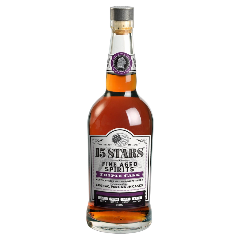 15 STARS Triple Cask Bourbon is a marriage of two Kentucky straight bourbons aged 16 & 8 years. This blend of mature bourbons was finished in port, cognac, and rum casks for 8 months to extract the unique influences of each of these spirits. Each finishing barrel provides a distinctly different dimension that when blended together creates a complex and interesting whiskey that is one of a kind.