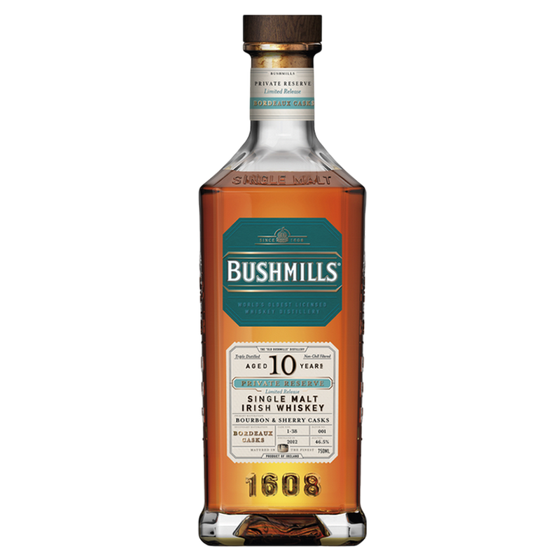 The Bushmills- Private Reserve Collection is a series of small batch single malts hand selected with unique cask finishes, born from the original Irish single malt tradition that Bushmills pioneered. This 10-Year-Old single malt Irish whiskey is first matured in carefully selected bourbon barrels and oloroso sherry casks for 6 years before finishing for a minimum of 4 years in first fill Pomerol Bordeaux casks.