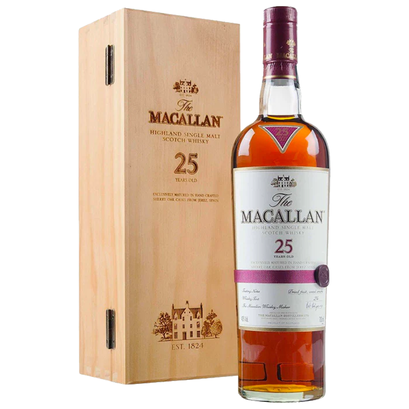 The Macallan Sherry Oak 25 Years Old forms part of our Sherry Oak Collection which features a series of single malt whiskies matured exclusively in hand-picked sherry seasoned oak casks from Jerez for richness and complexity. This special single malt delivers an intensely rich and full flavour character, citrus, dried fruits and wood smoke.