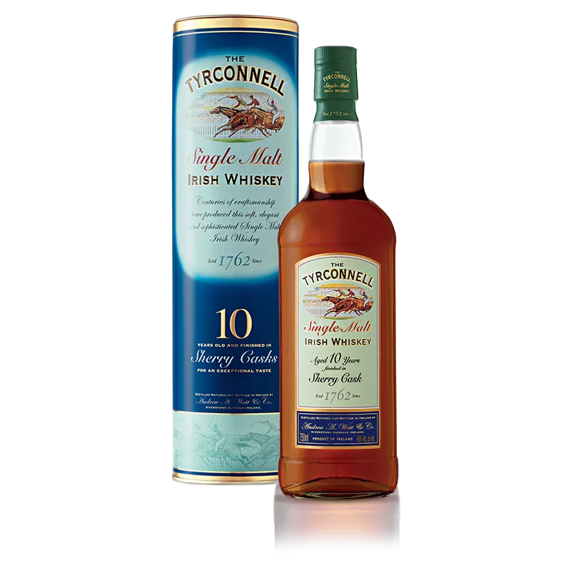 After ten years spent in bourbon barrels, The Tyrconnell' Sherry Cask Finish spends an additional 6-8 months in Oloroso Sherry casks from Spain. The casks exert their influence on the whiskey, creating a noticeably darker finished product. The interaction of single malt and fortified wine casks creates a veritable dessert in a glass, in which thick notes of sherry find themselves melding amongst hints of tarte tatin and custard.